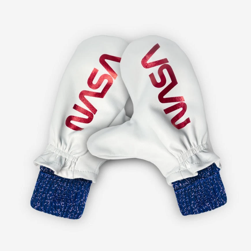 Stay cozy and warm with these NASA mittens! Made with a high-quality genuine white leather outer mitt and lined with a removable royal blue and white speckled knit mitten liner, these are guaranteed to make you the stylish human in the universe.