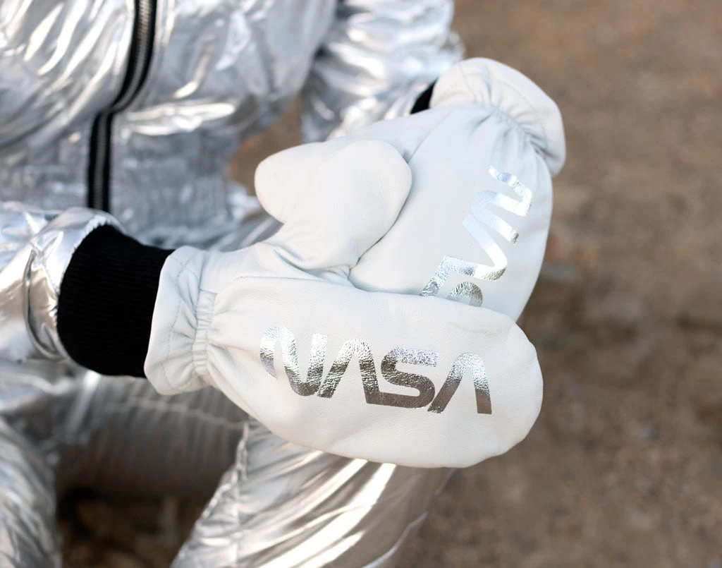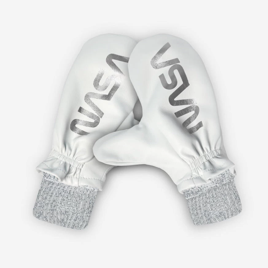 Stay cozy and warm with these NASA mittens! Made with a high-quality genuine white leather outer mitt and lined with a removable gray speckled knit mitten liner, these are guaranteed to make you the stylish human in the universe.