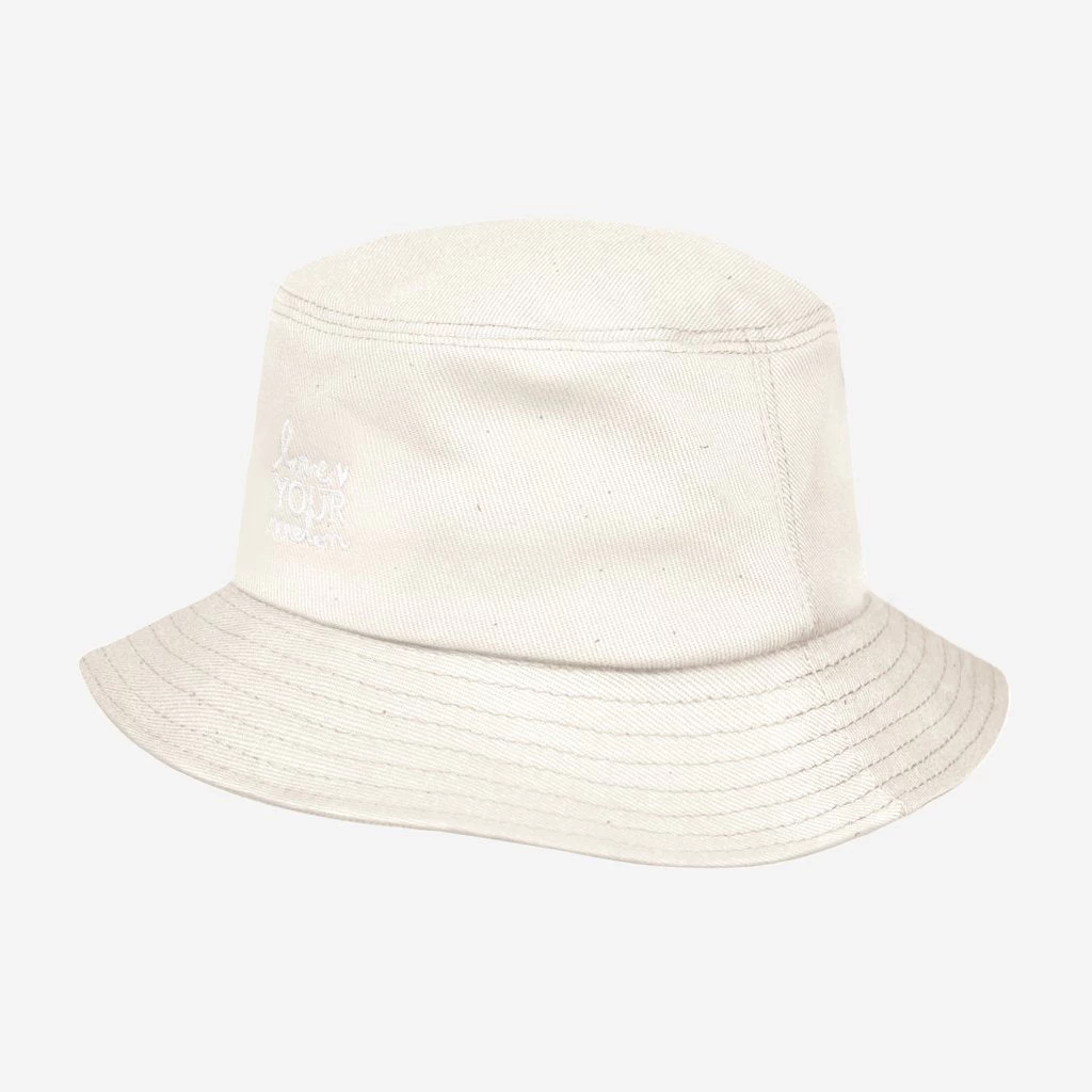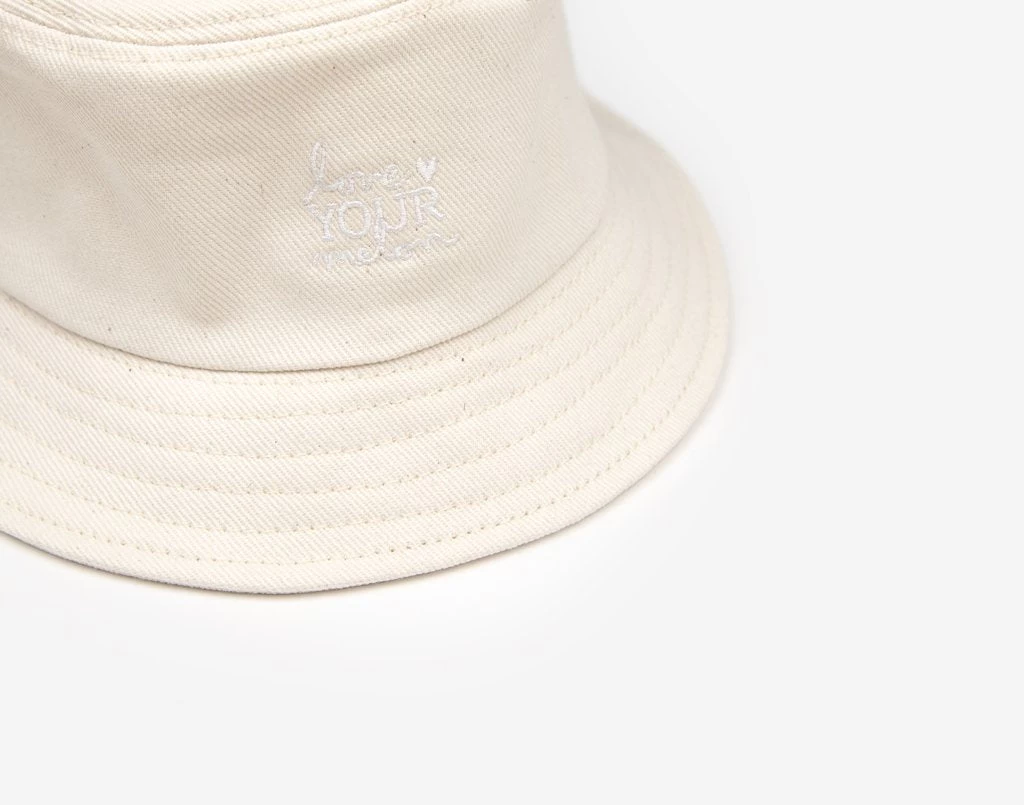 This natural kids cotton bucket hat features the stacked Love Your Melon logo embroidered on the front in white, side eyelets and a stitched brim.
