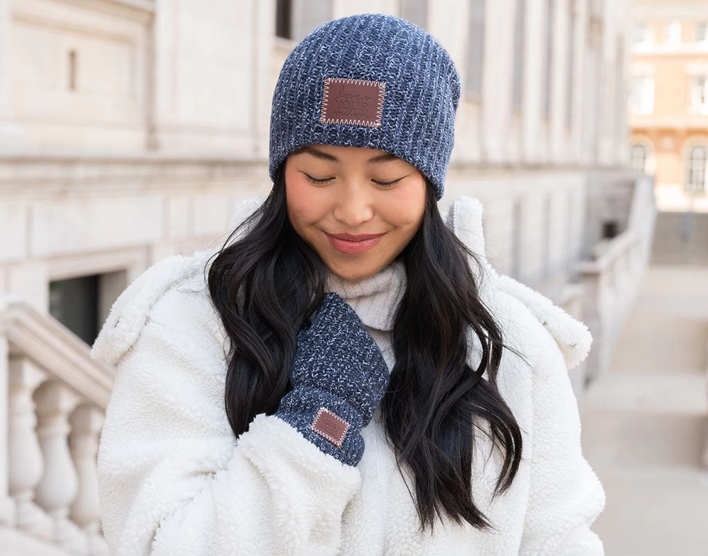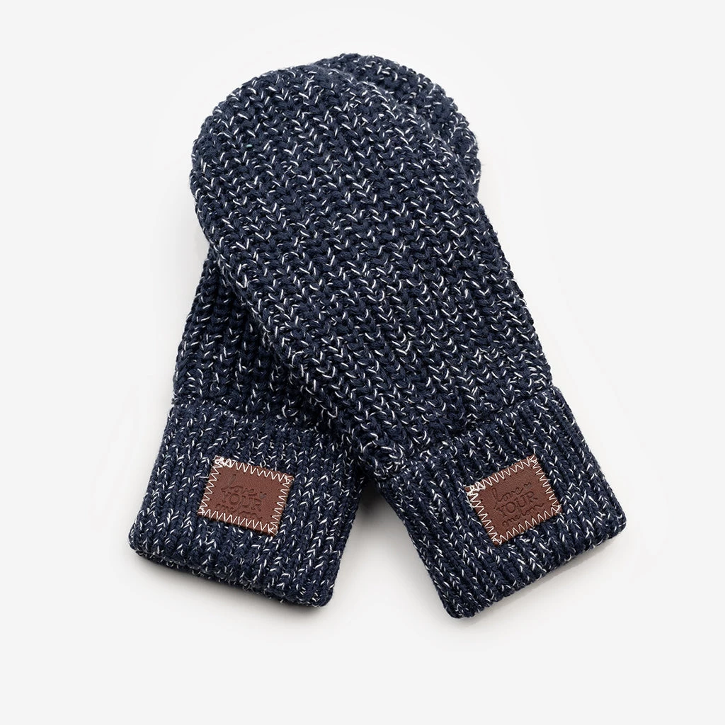 Prepare to be cozy! These knit mittens in speckled navy and white are lined with soft fleece for extra warmth. A classic red maple leather patch debossed with the Love Your Melon logo is featured on each of the elasticated cuffs.
