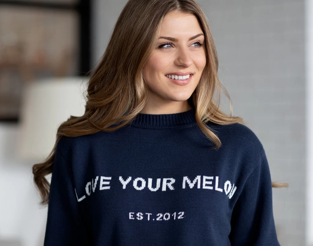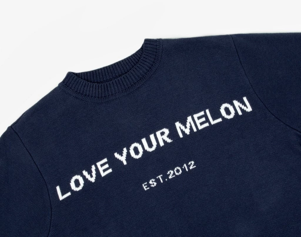 This classic logo sweater is made out of 100% Cotton Yarn in navy yarn and features the Love Your Melon Est. 2012 Logo knit in white on the front. These sweaters feature a crewneck style, ribbed cuffs, and a loose oversized fit. Womens fit. See chart below for sizing.