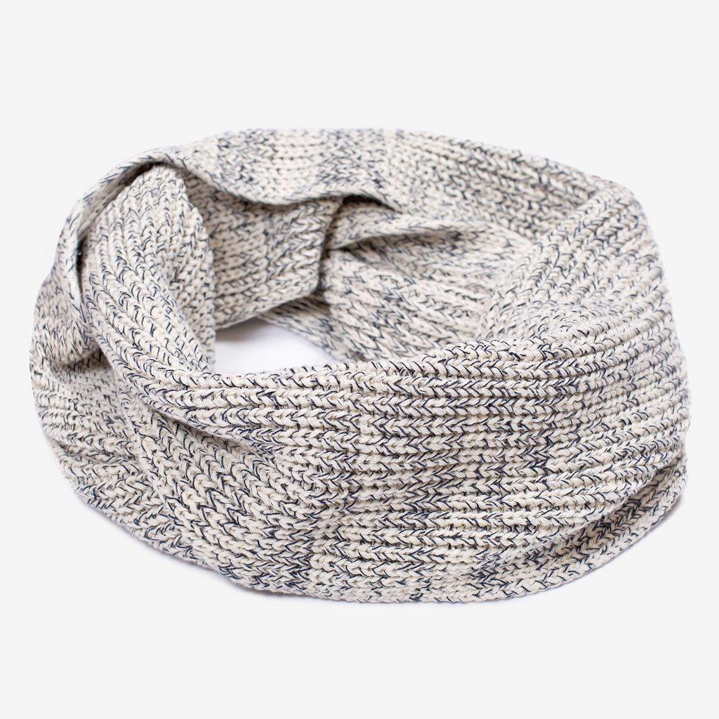 This infinity circle scarf is knit out of 100% cotton yarn in natural and navy yarn colors and features a brown leather patch that is debossed with the Love Your Melon logo. Machine washable, durable.