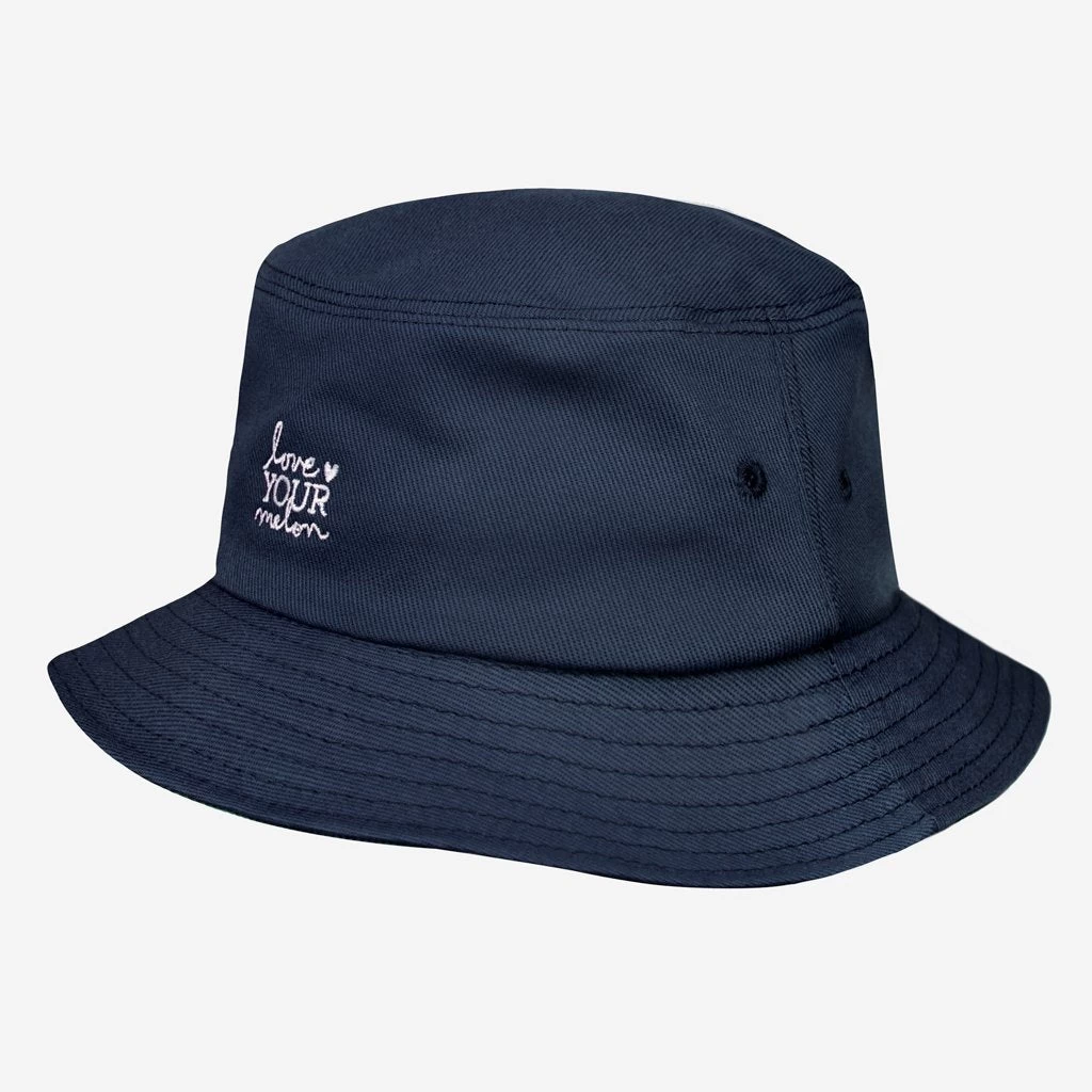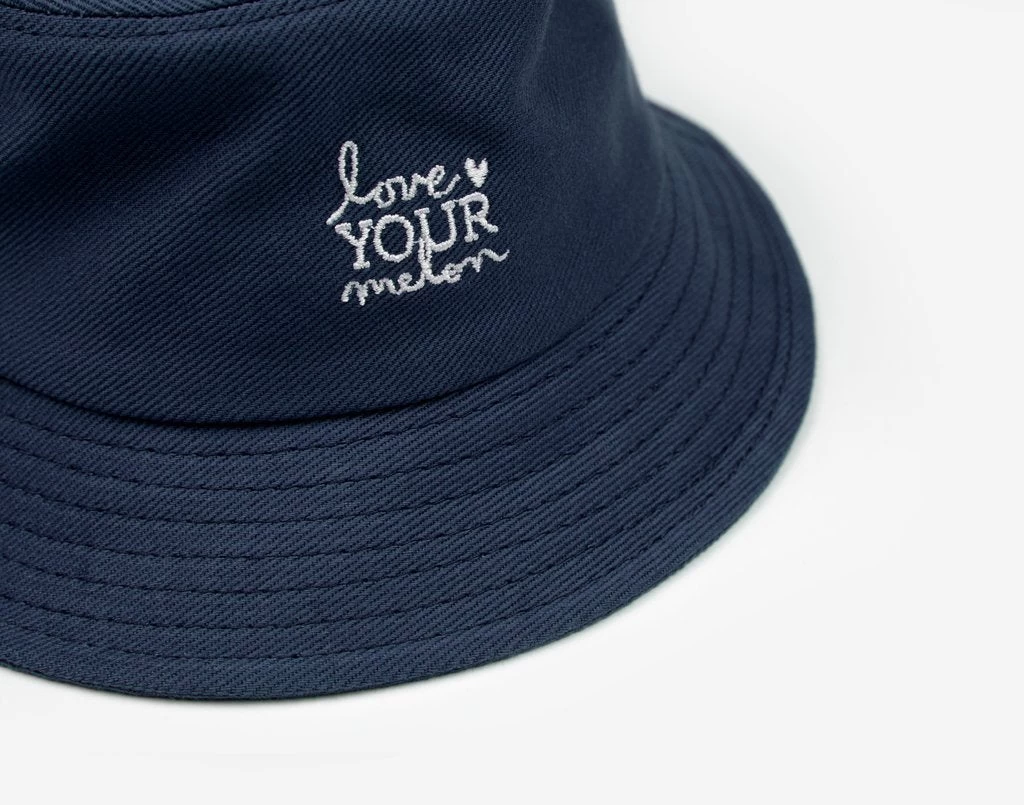 This cotton oxford blue bucket hat features the stacked Love Your Melon logo embroidered on the front in white, side eyelets and a stitched brim.