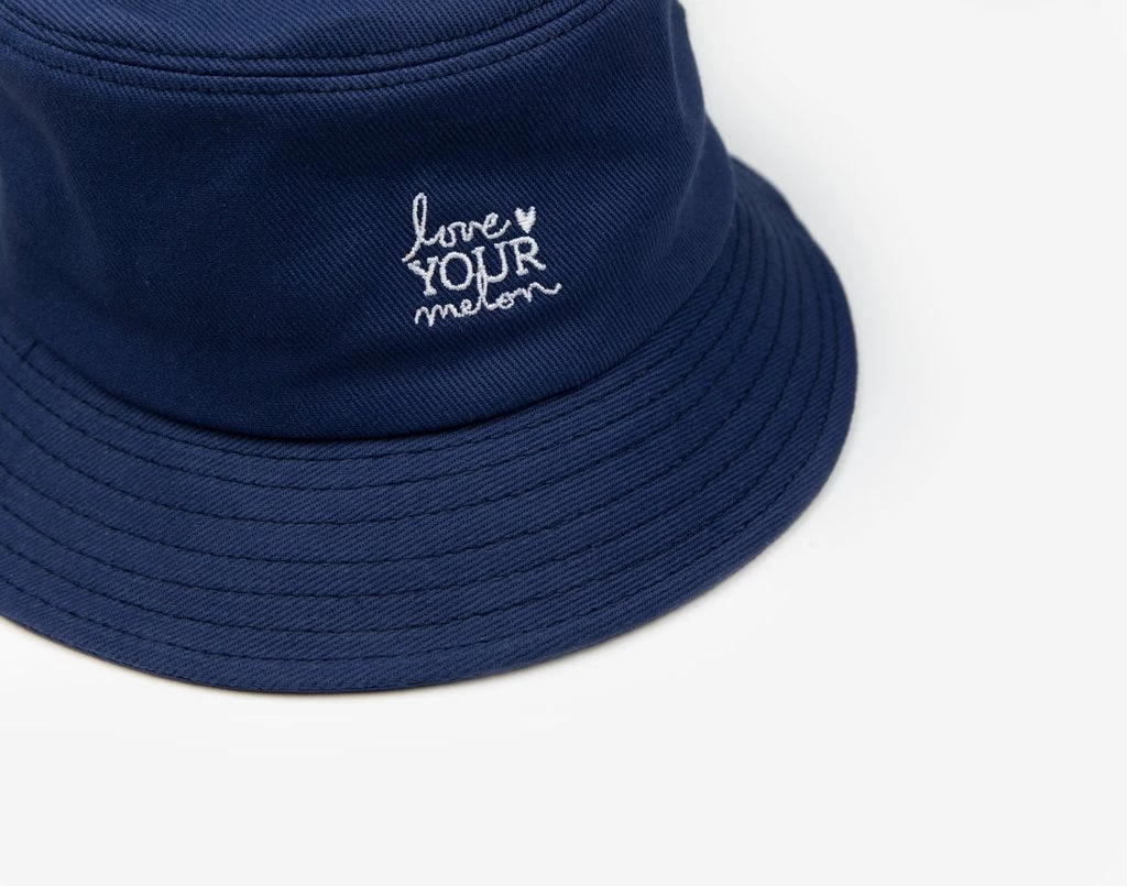 This pacific blue baby cotton bucket hat features the stacked Love Your Melon logo embroidered on the front in white, side eyelets and a stitched brim.