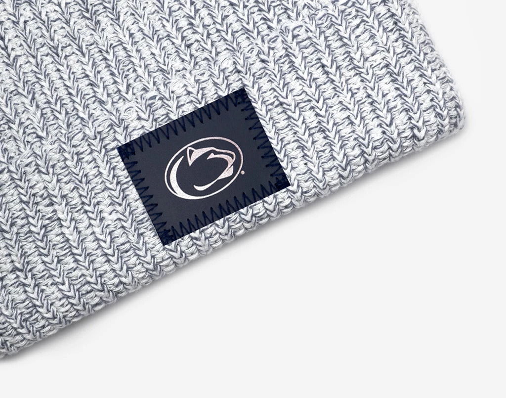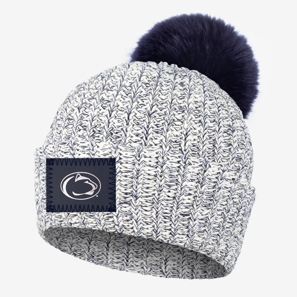 Go Nittany Lions! This Navy Speckled Beanie features a navy leather patch with the Pennsylvania State Nittany Lions logo debossed in white foil. Made from our coziest double-thick knit, and topped with a detachable, interchangeable navy faux fur pom.