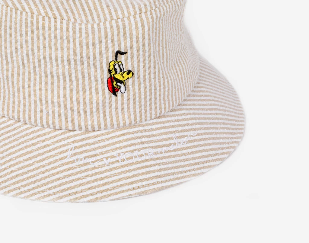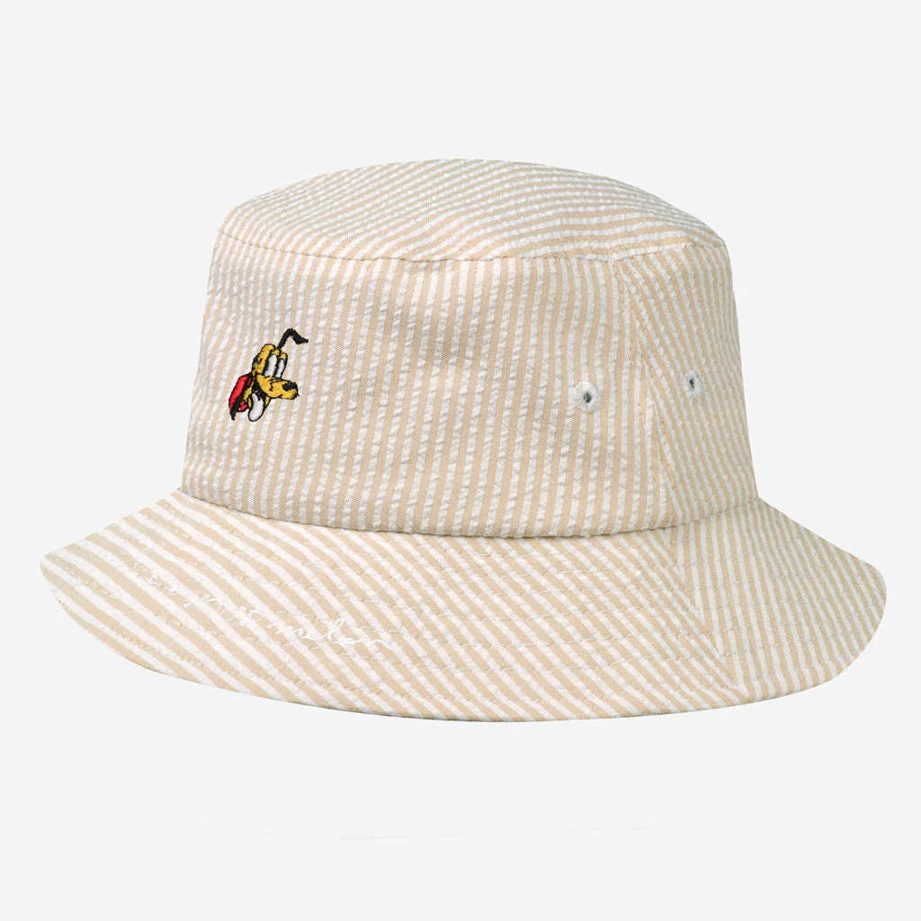 This Pluto natural seersucker bucket hat will have you smiling from ear to ear! This cap is made from a stylish seersucker striped fabric that is lightweight, breathable, and soft with the Pluto face embroidered on the center front, and the Love Your Melon logo embroidered over the front brim. This bucket hat features a double stitched brim with embroidered eyelets for air flow.