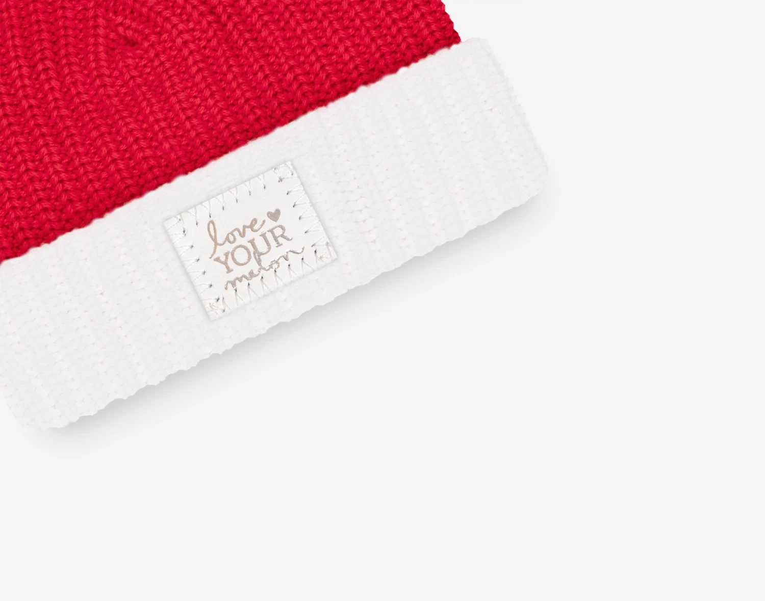 This double-thick classic red and white knit baby beanie is made from 99% Cotton and 1% LYCRA®. It is branded with a mini white leather patch debossed with the Love Your Melon logo on the front in gold metallic and a detachable white faux fur pom. This beanie is incredibly cozy and the perfect classic essential for your newbie.