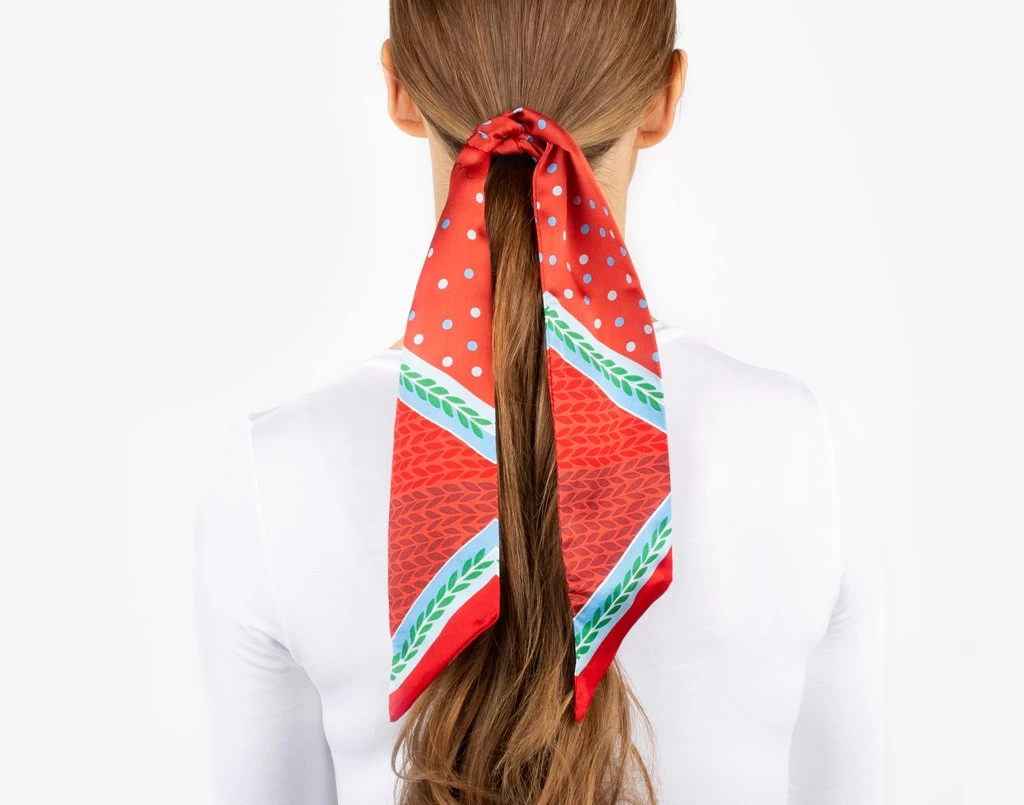 This red scarf is 100% silk and hand-screened. It features a uniquely designed multicolor polka dot and knit print in hues of red, blue, and sage.