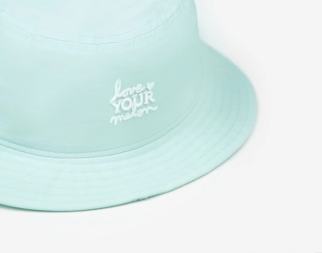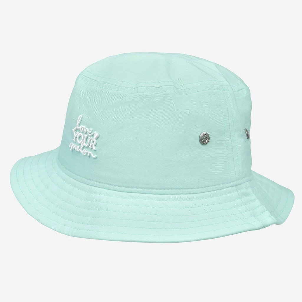 This seafoam green bucket hat features the stacked Love Your Melon logo embroidered on the front in white, side metal rivet eyelets and a stitched brim. The fabric is lightweight, water-resistant and wicking, and durable with SPF 20+.
