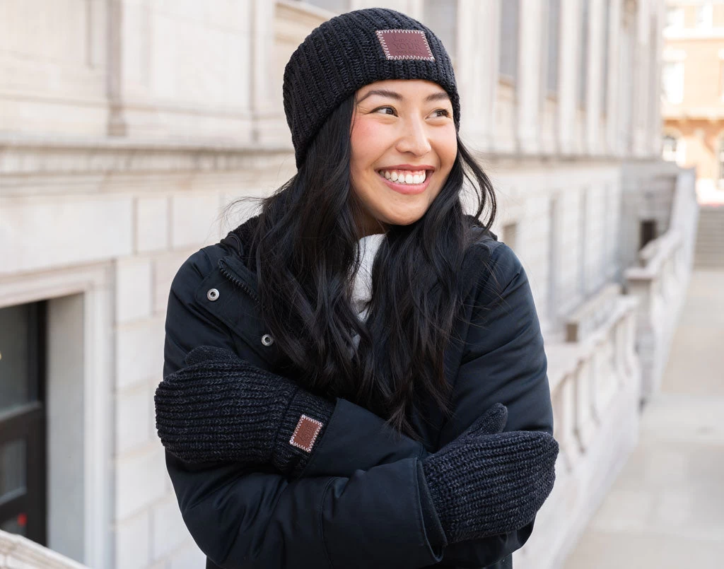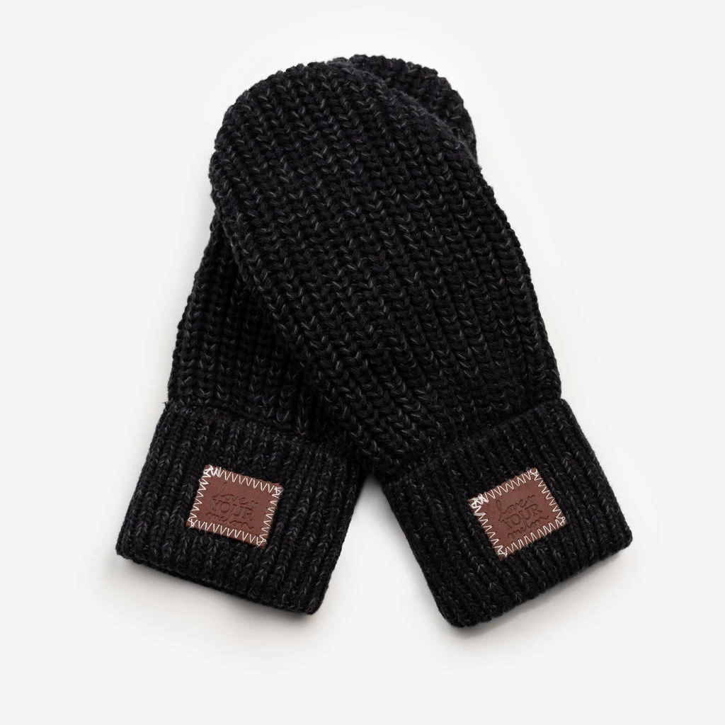 Prepare to be cozy! These knit speckled mittens in a cool smoke gray are lined with soft fleece for extra warmth. A classic red maple leather patch debossed with the Love Your Melon logo is featured on each of the elasticated cuffs.
