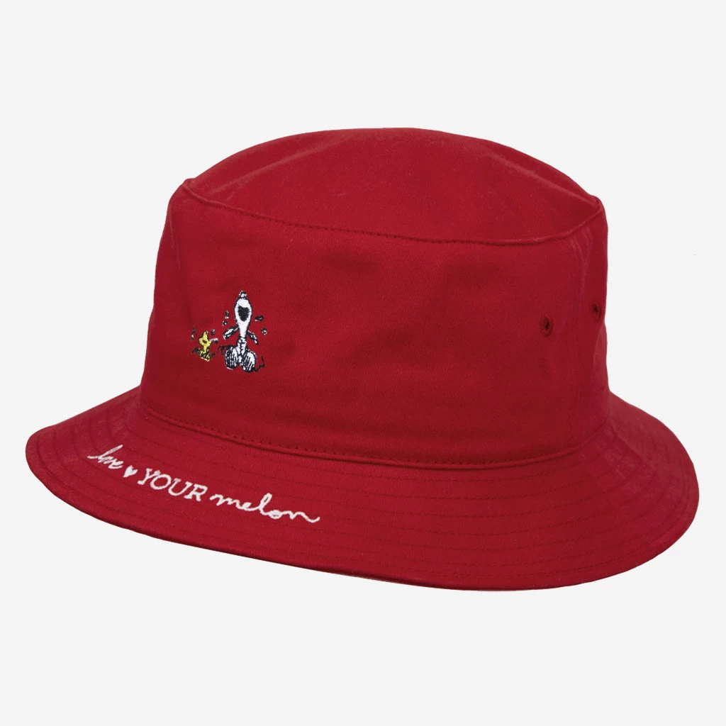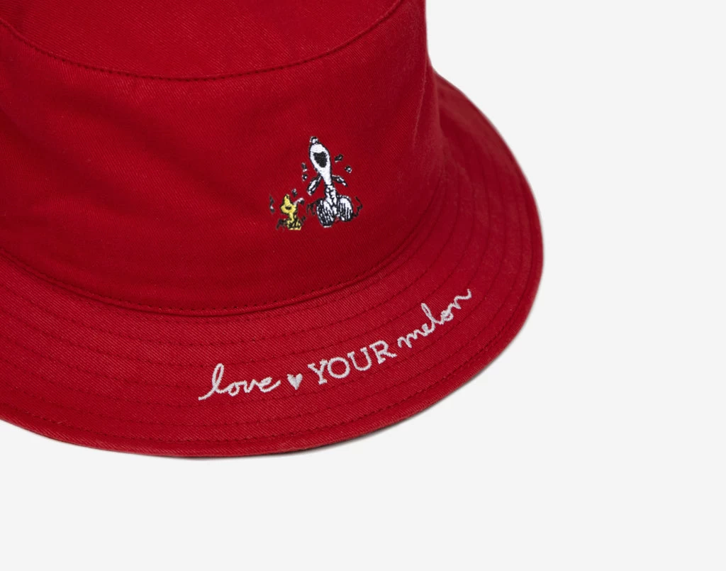 Take a trip down memory lane with the much-loved Peanuts comic strip in this red bucket hat! This fun red bucket hat features Snoopy and Woodstock laughing embroidered on the front and the Love Your Melon cursive logo embroidered along the front brim.
