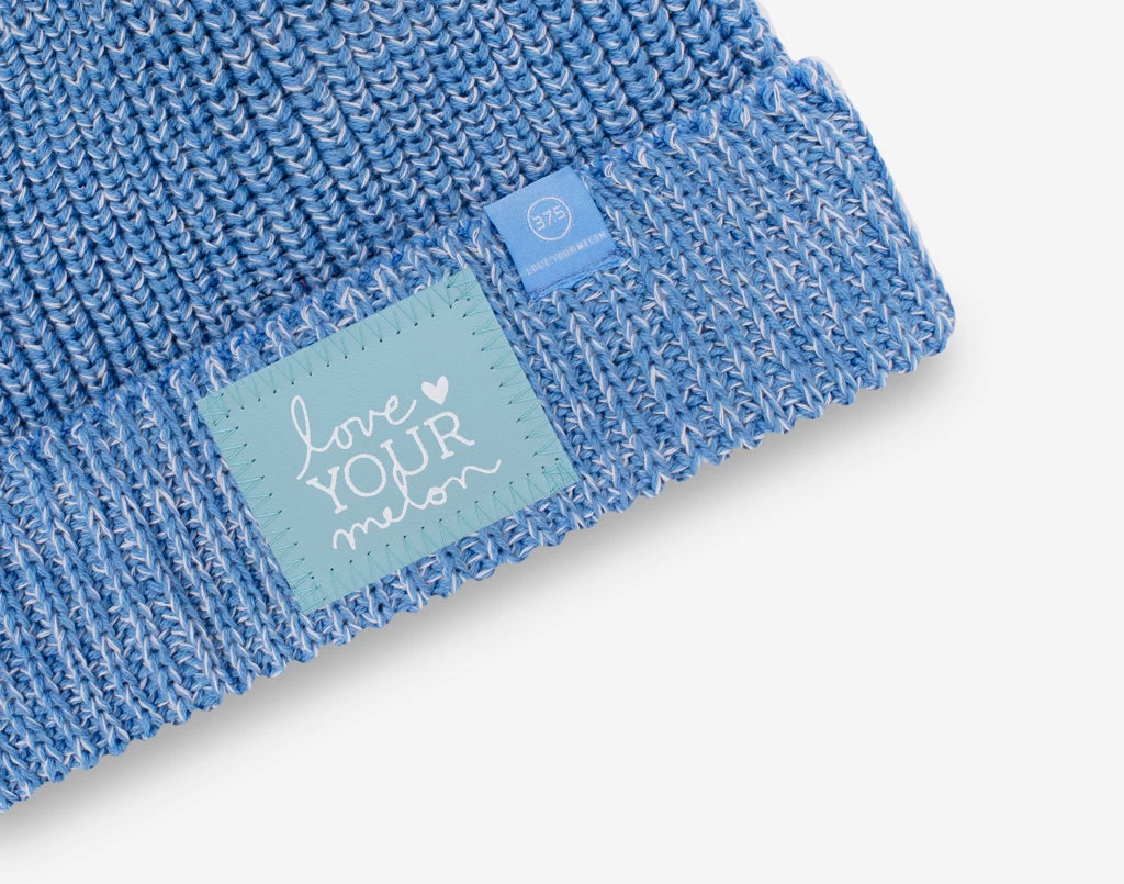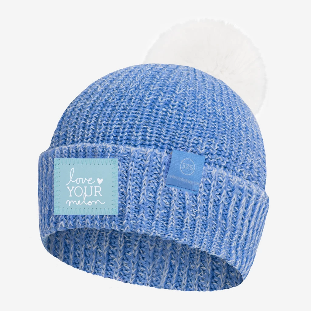 These beanies also feature a soft blue leather patch with the Love Your Melon logo debossed in white as well as a monochrome co-branded 37.5 x Love Your Melon tag on the side and a detachable white faux fur pom.