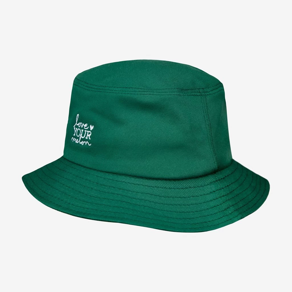 This spruce kids cotton bucket hat features the stacked Love Your Melon logo embroidered on the front in white, side eyelets and a stitched brim.