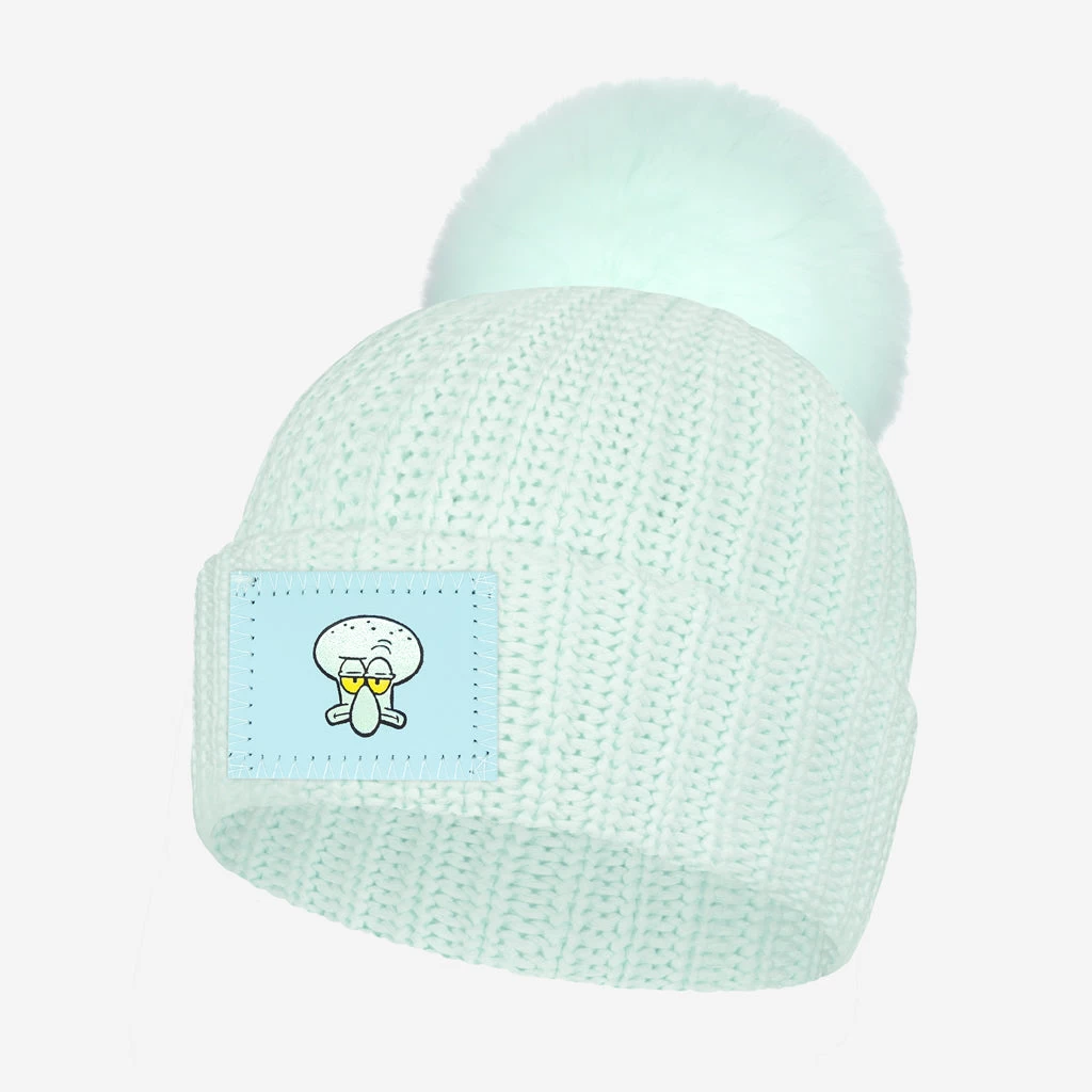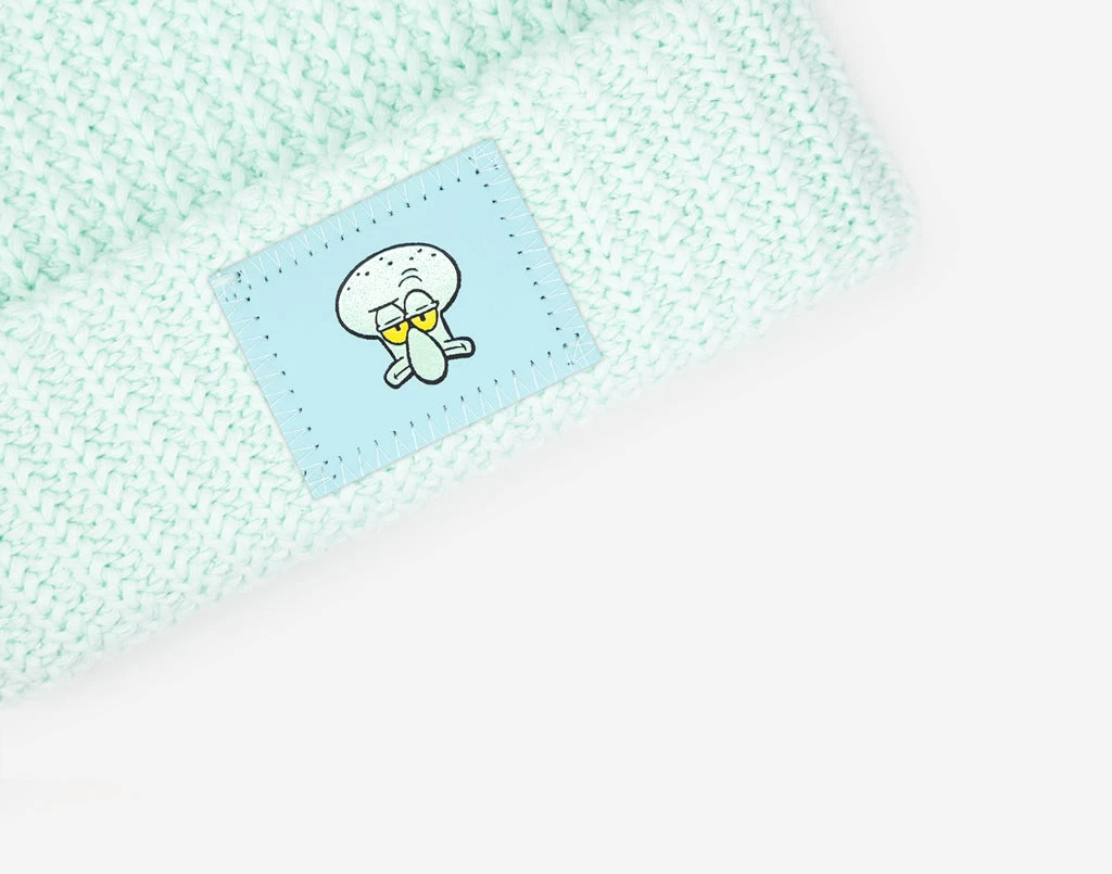 Show your love for Squidward in this cozy seafoam pom beanie! This beanie features a seafoam leather patch debossed with multicolor foil and a detachable seafoam faux fur pom. This beanie is perfect for any adventure under the sea!