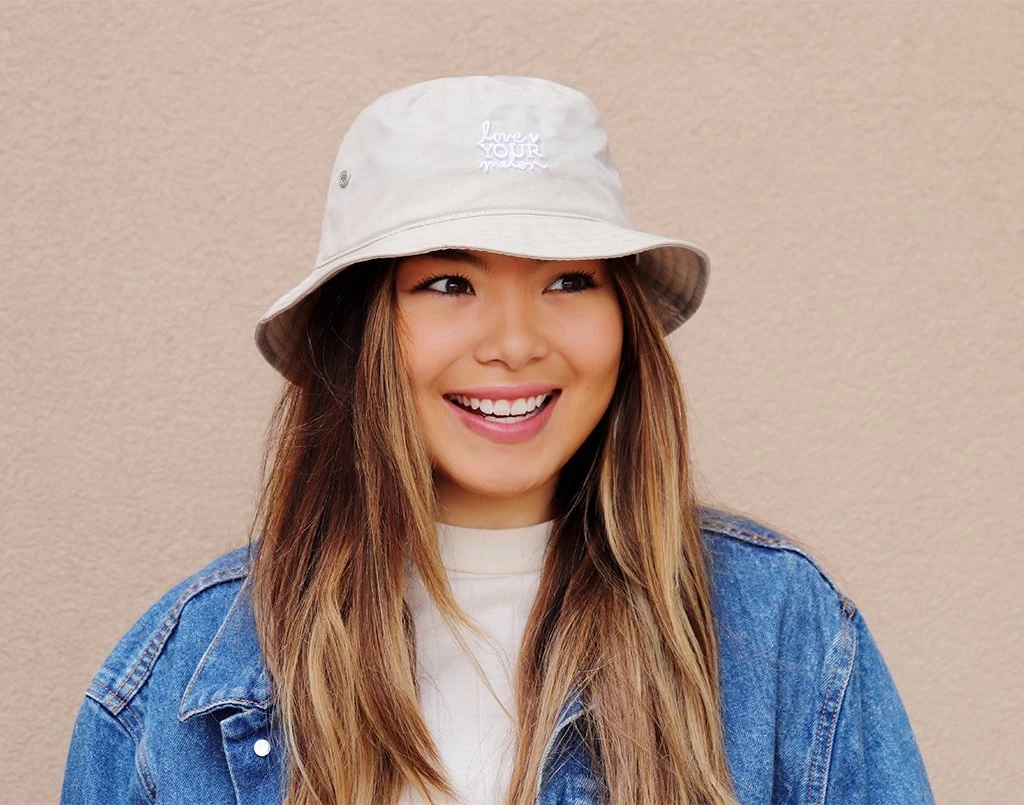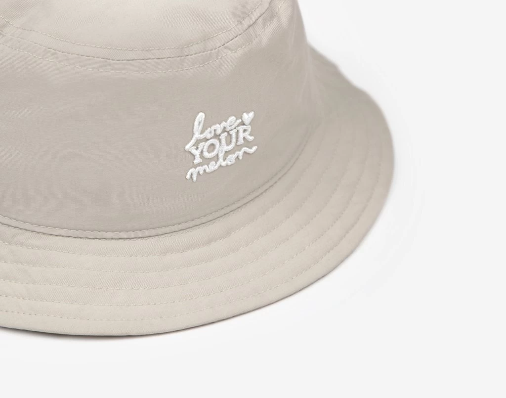 This tan nylon bucket hat features the stacked Love Your Melon logo embroidered on the front in white, side metal rivet eyelets and a stitched brim. The fabric is lightweight, water-resistant and wicking, and durable with SPF 20+.