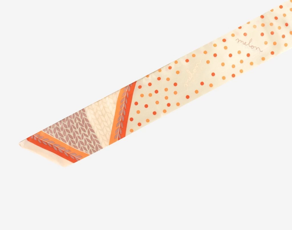 This tan scarf is 100% silk and hand-screened. It features a uniquely designed multicolor polka dot and knit print in hues of tan, marigold, and orange.