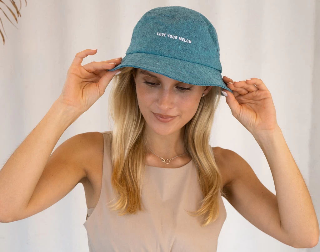 Beat the heat, coastal style! This lightweight, breathable, 100% linen bucket hat in vivid teal is your pack-and-go summer staple. The Teal Linen Bucket Hat features the Love Your Melon block logo embroidered on the center front in white.