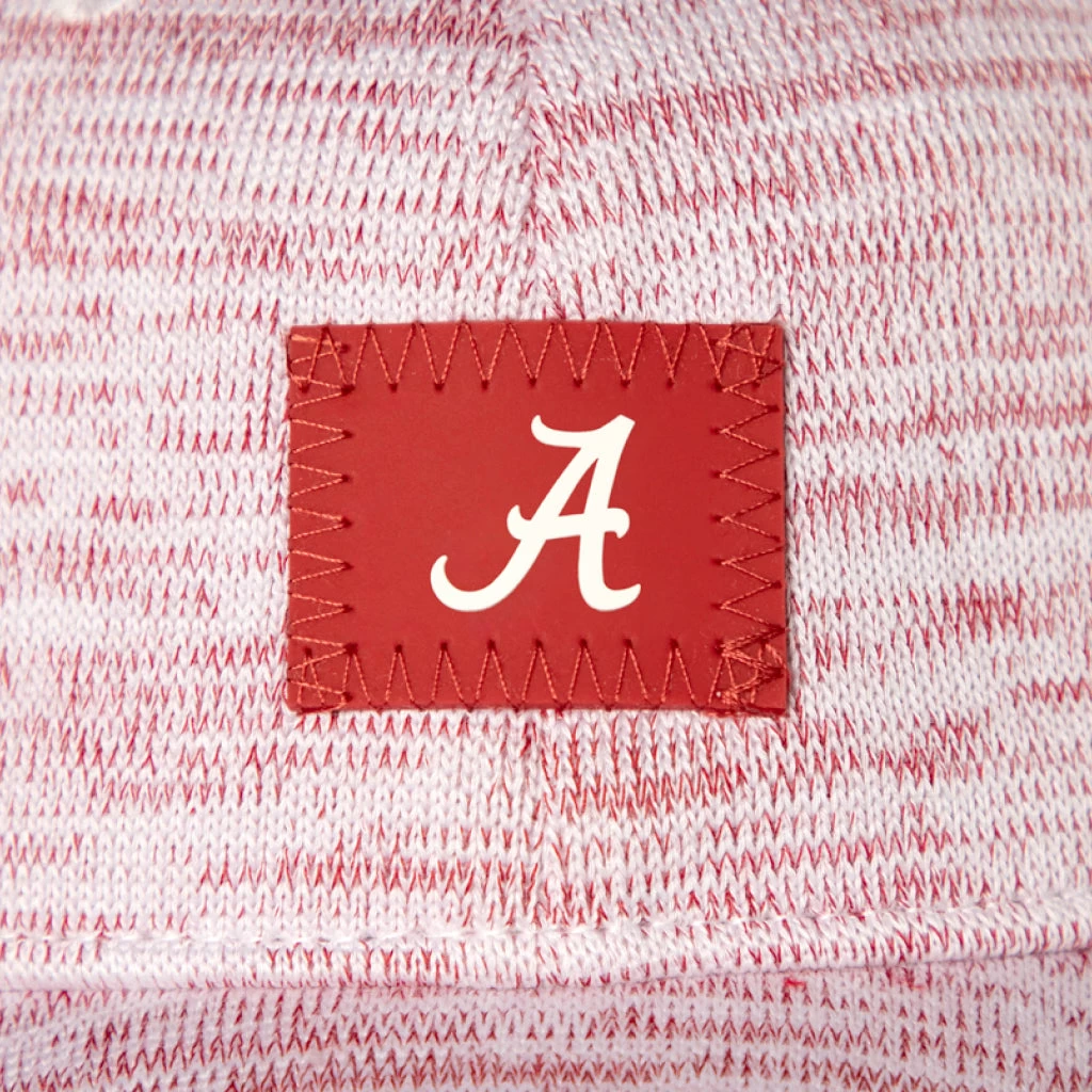 This crimson and white speckled beanie features a red leather patch with the Alabama Crimson Tide logo debossed in a white foil.