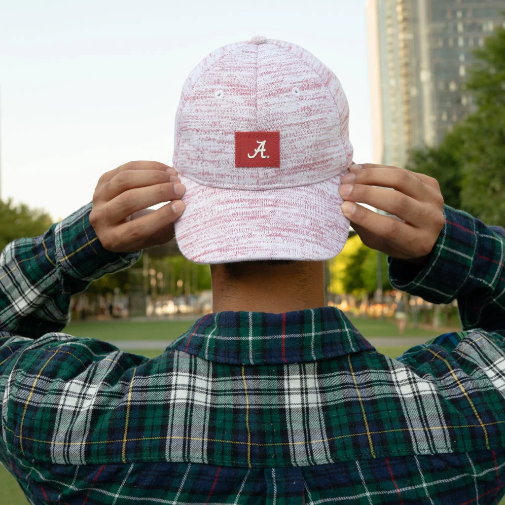 This White and Crimson Speckled Hero Cap features a University of Alabama silicone patch at the front, and a Love Your Melon branded rivet on the back.