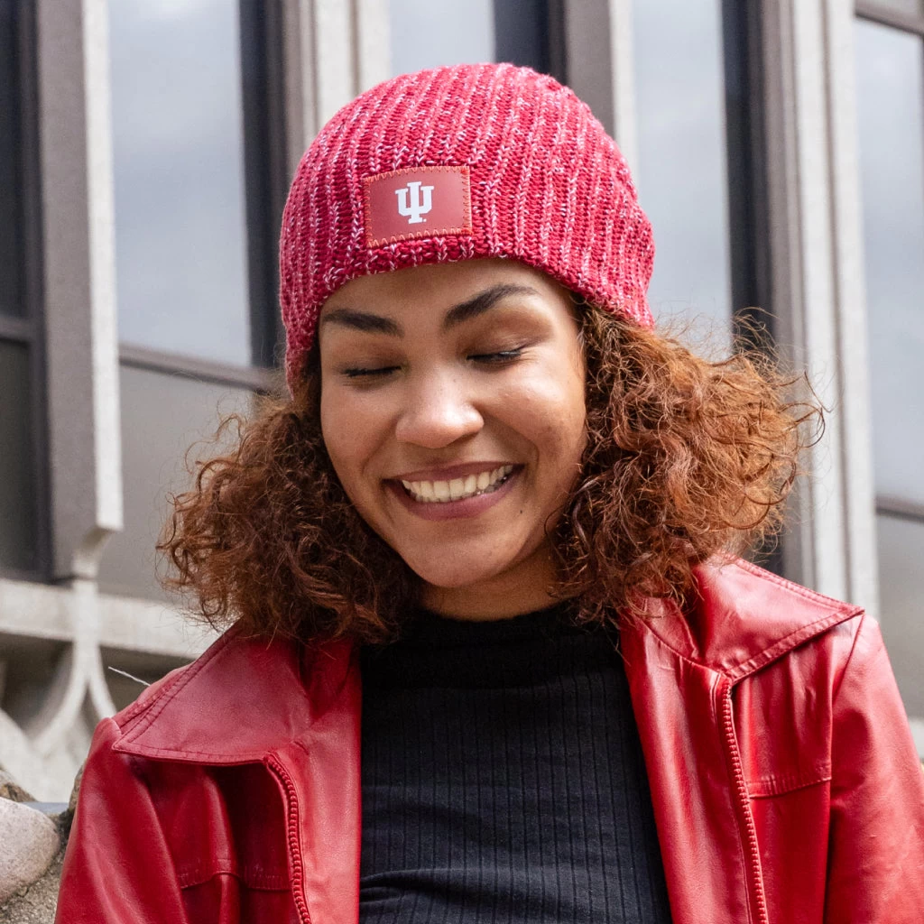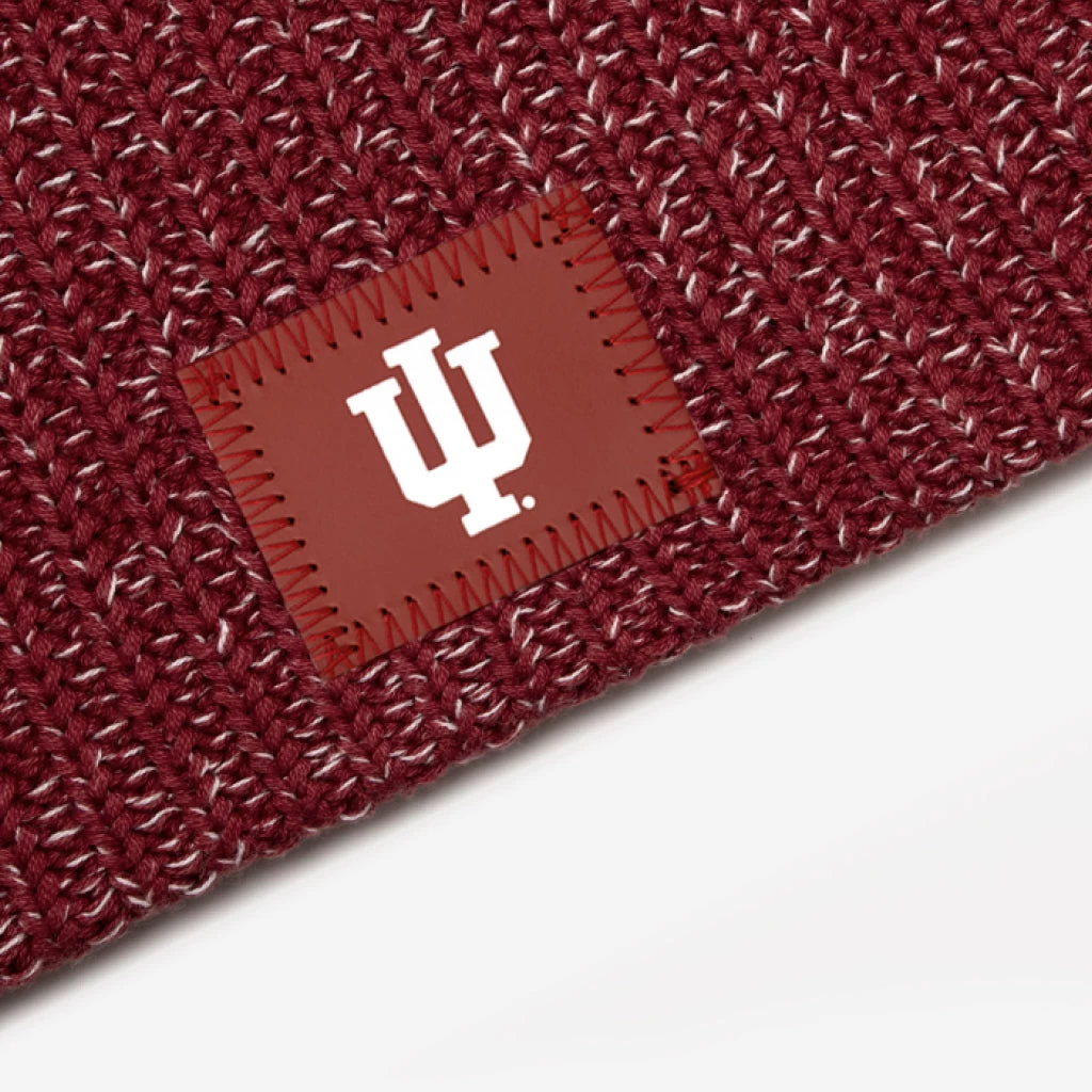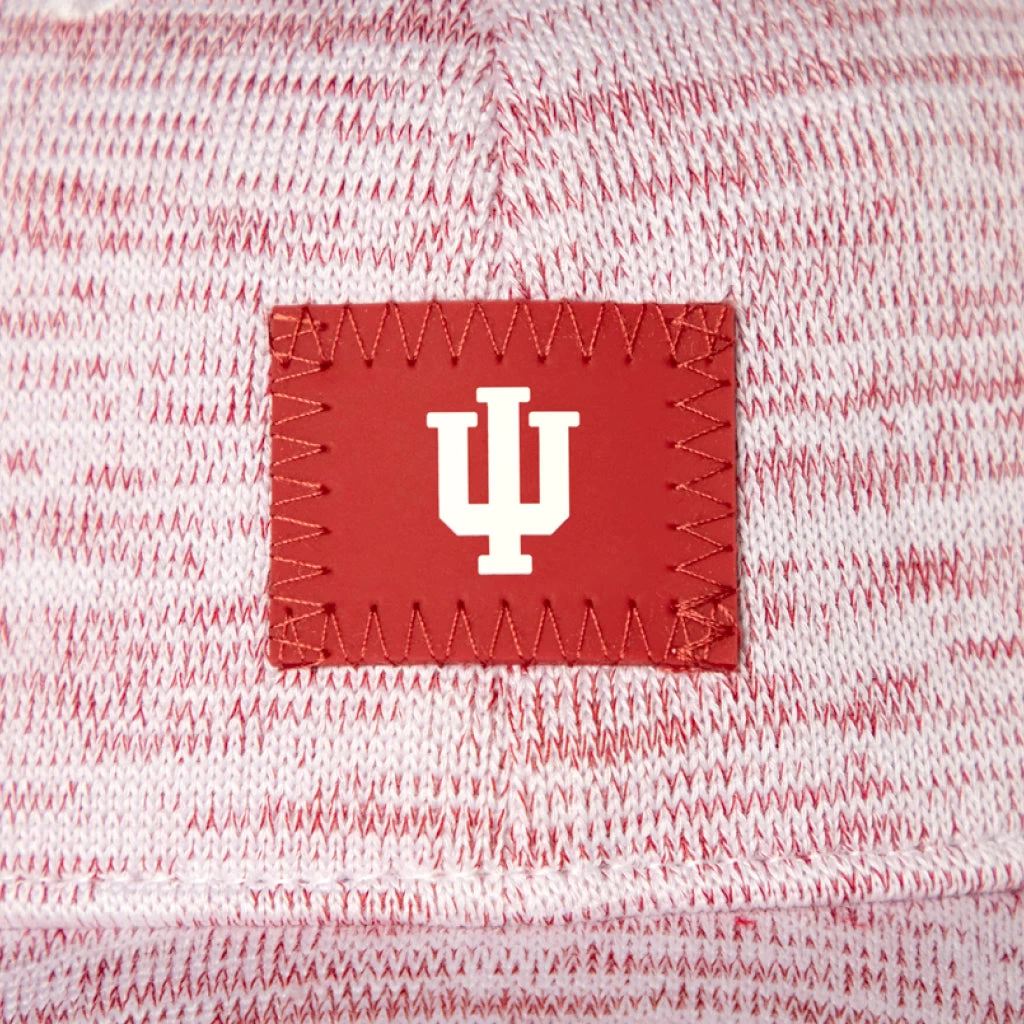This Crimson and White Speckled Beanie features a red leather patch with the Indiana Hoosiers logo debossed in white foil.
