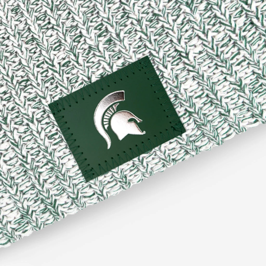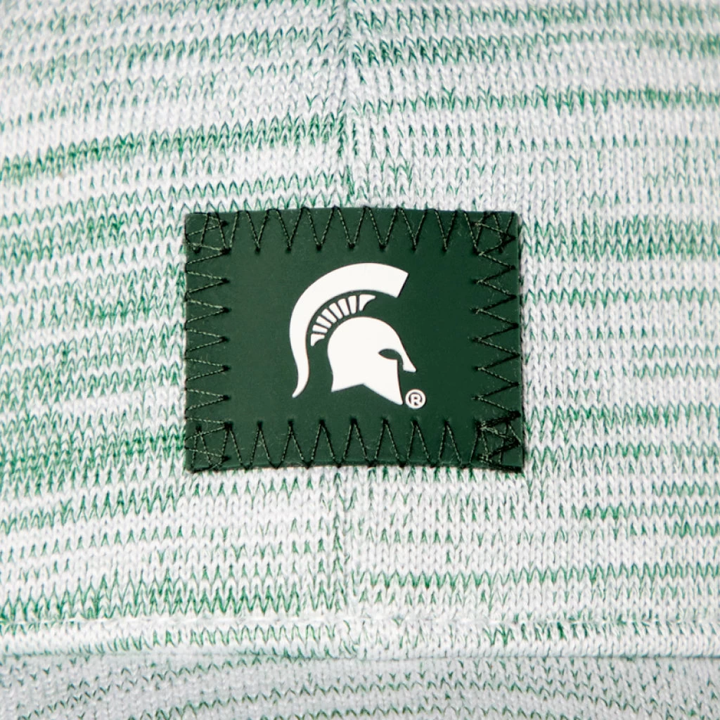 This white and hunter green speckled beanie features a green leather patch with the Michigan Spartans logo debossed in metallic silver foil.