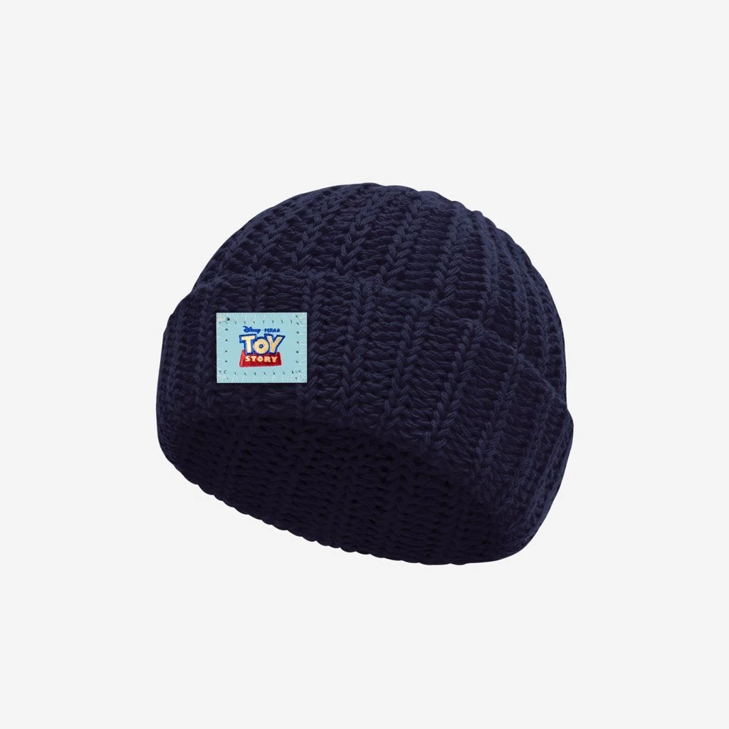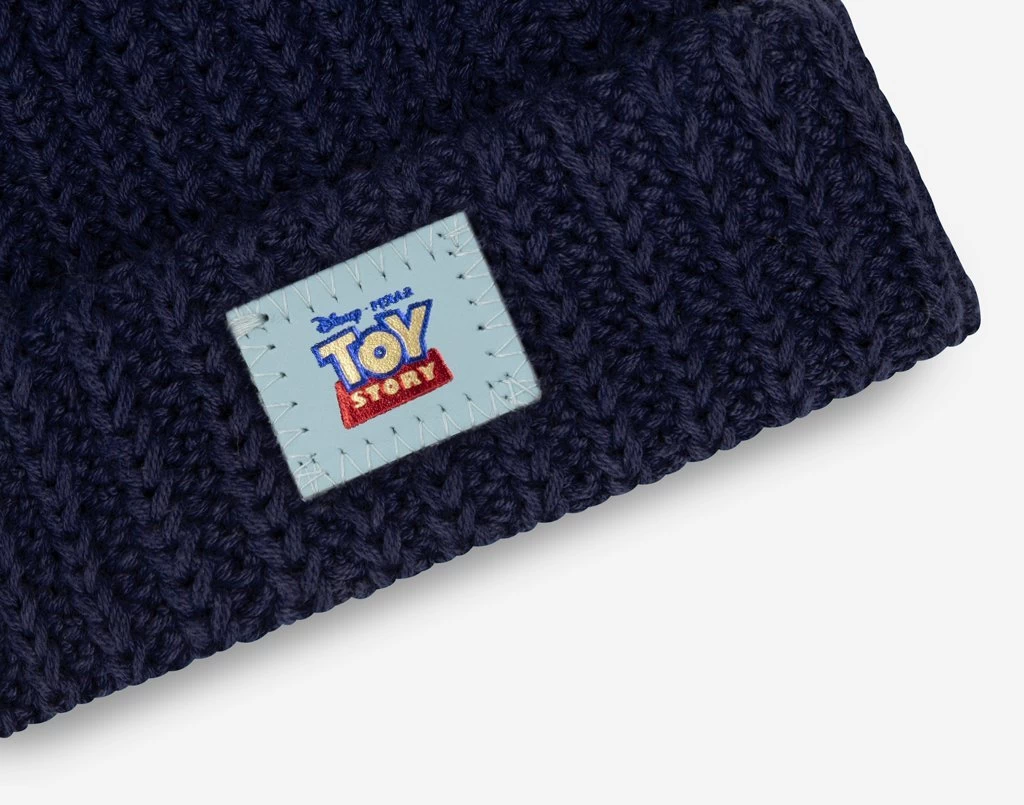 The toys are back in town! This fun baby cuffed beanie celebrates the Toy Story logo debossed in tri color foil on light blue genuine leather. These beanies are incredibly cozy and fit more snug.