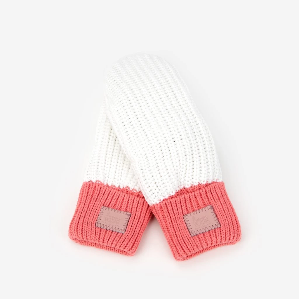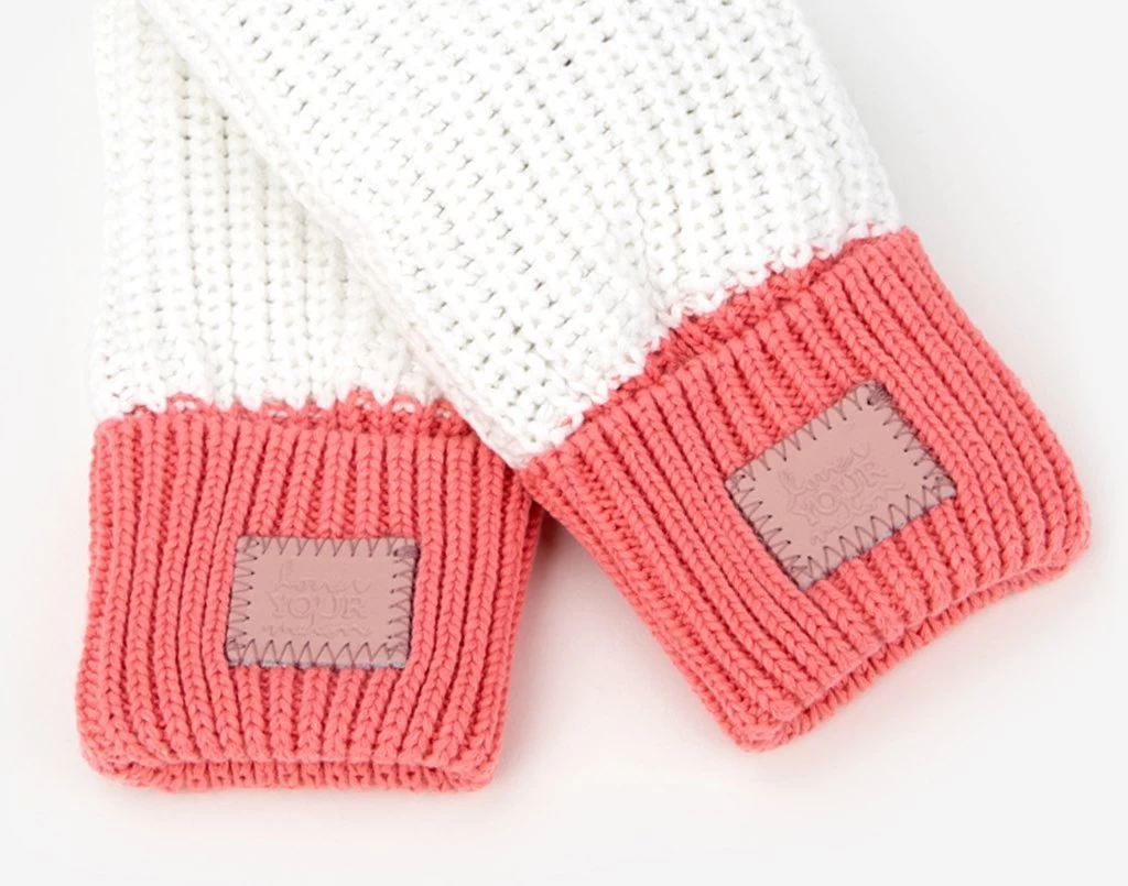These white and salmon knit mittens are the perfect winter accessory for a day on the slopes or hanging around the chalet! These mittens are very cozy and warm and feature a mini leather patch debossed with the Love Your Melon logo on the outer cuff.