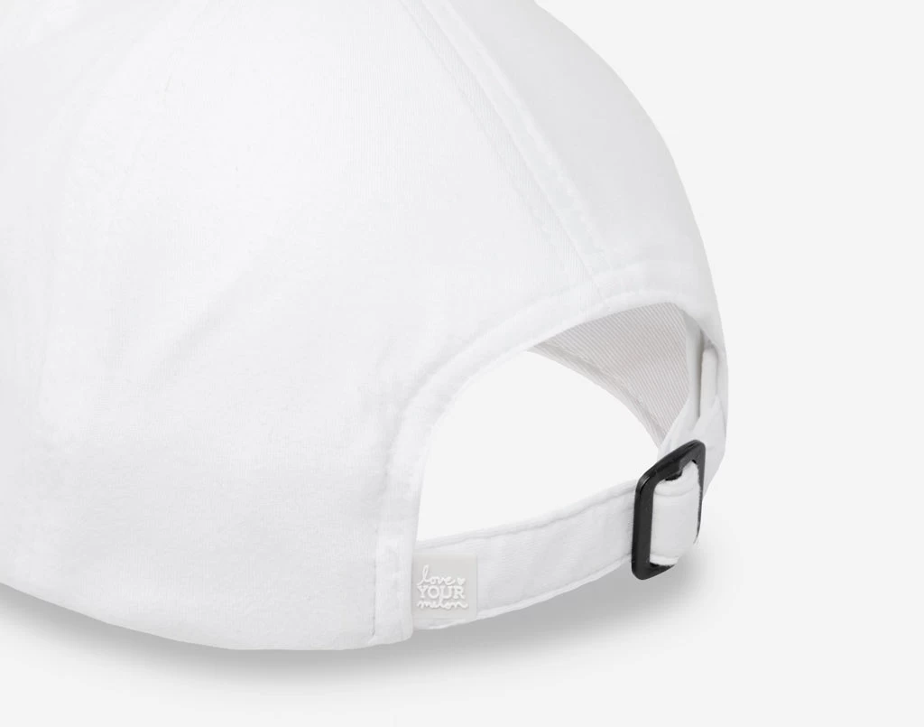 This white athletic cap features the Love Your Melon stacked monochrome logo embroidered on the front, an adjustable slider strap at the back, and a rubber branded tag on the back strap. This unstructured cap is perfect for a casual day or your hardest workout!