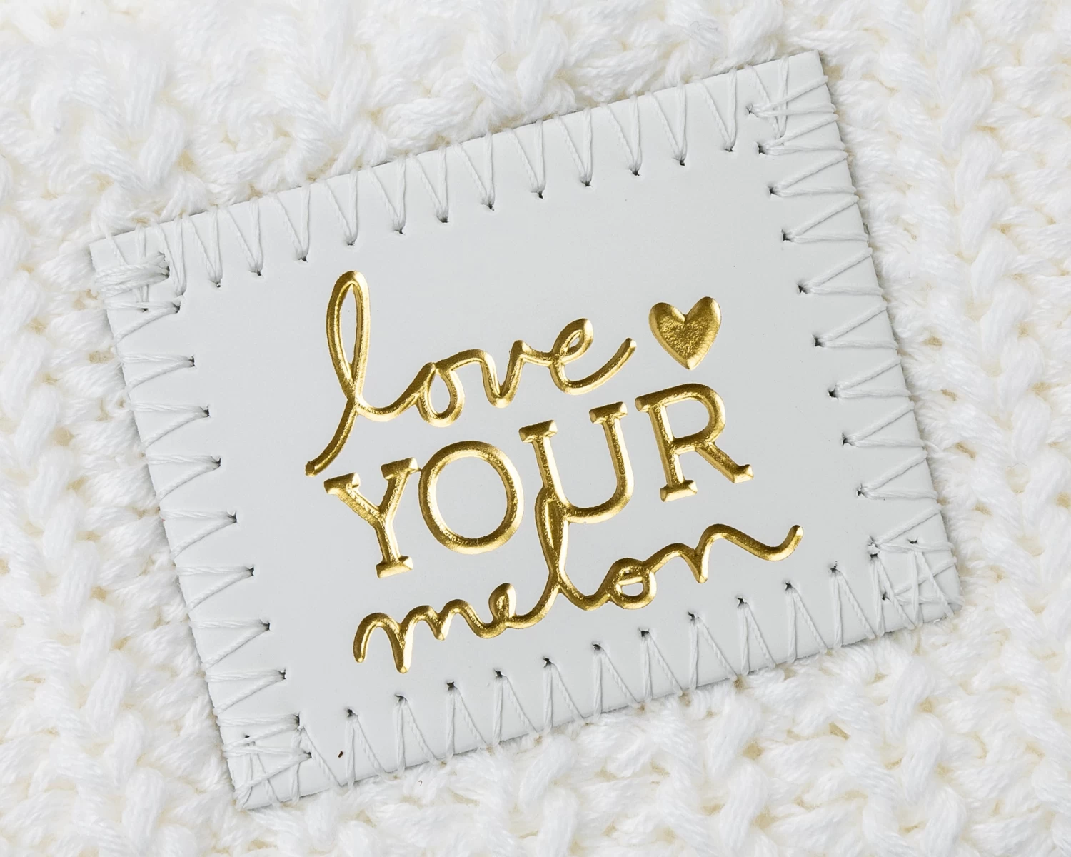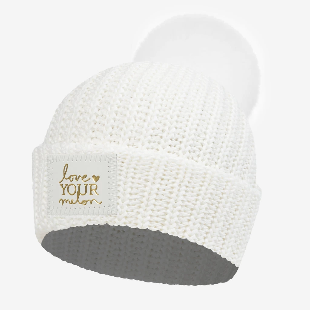 This white monochrome cuffed pom beanie features a white leather patch debossed with the Love Your Melon logo in gold foil and topped with a detachable faux fur pom in white.