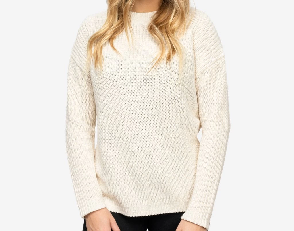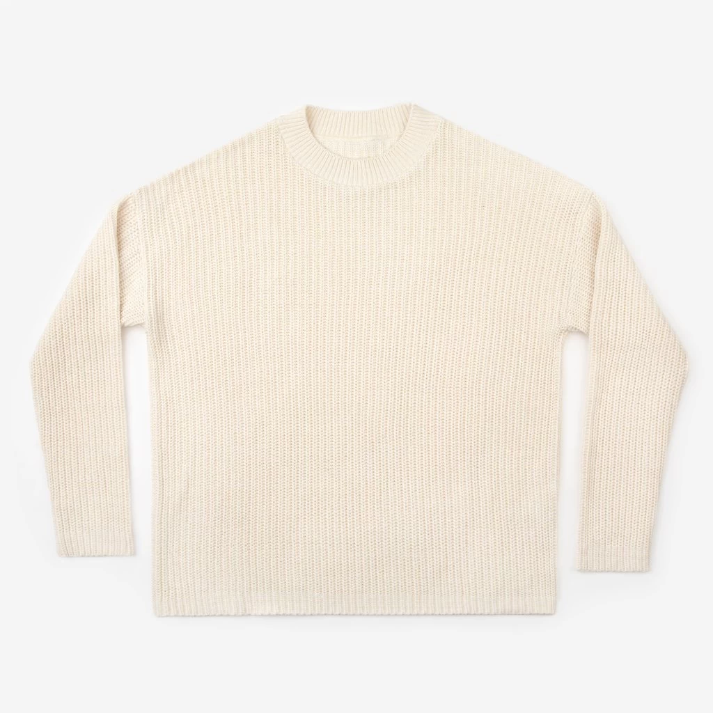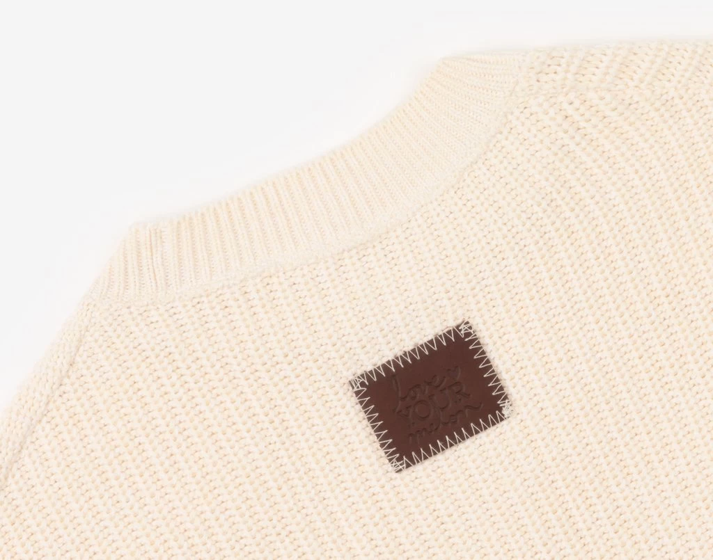 This knit crewneck sweater is knit in natural and white colors and features a crew neck style, drop shoulder sleeves, and a true to size fit with a subtle mini branded red maple tag on the back neck.