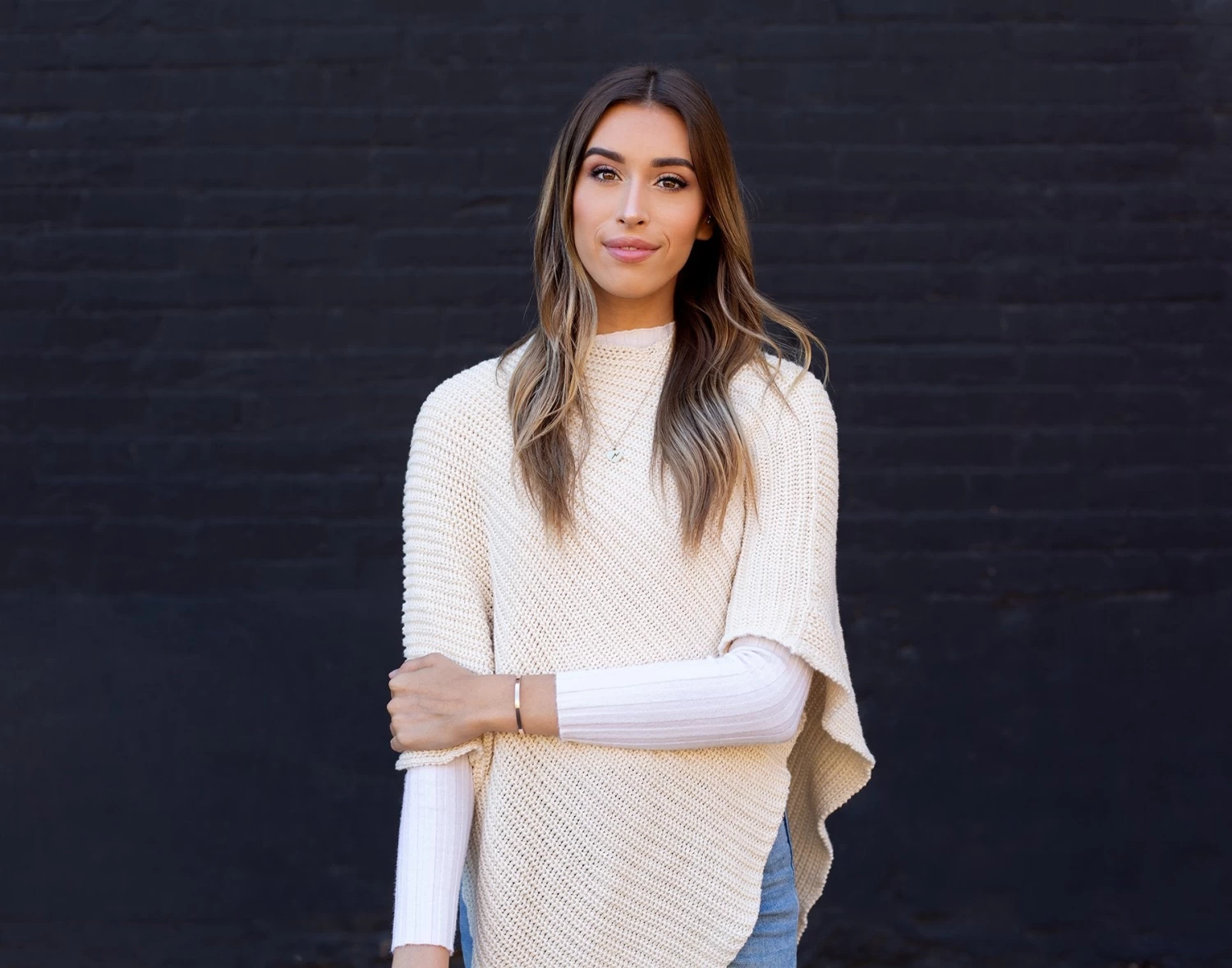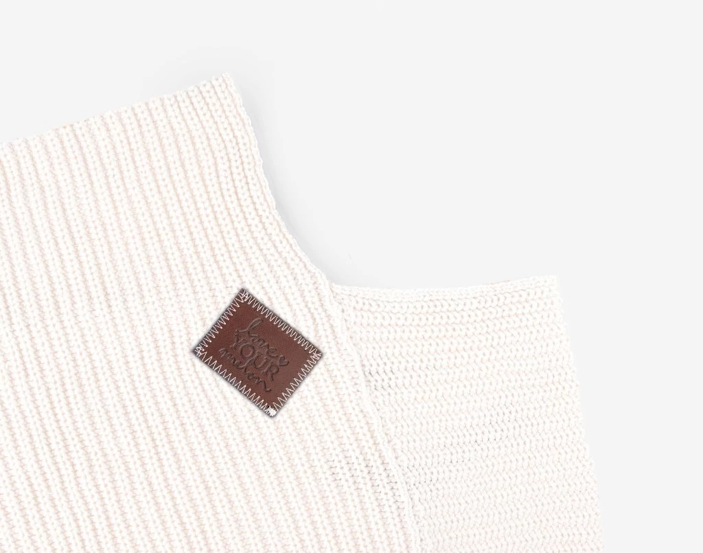 This shawl is knit in 100% cotton yarn in a white speckled color and features a brown leather patch debossed with the Love Your Melon logo on the back. One size. Machine washable.