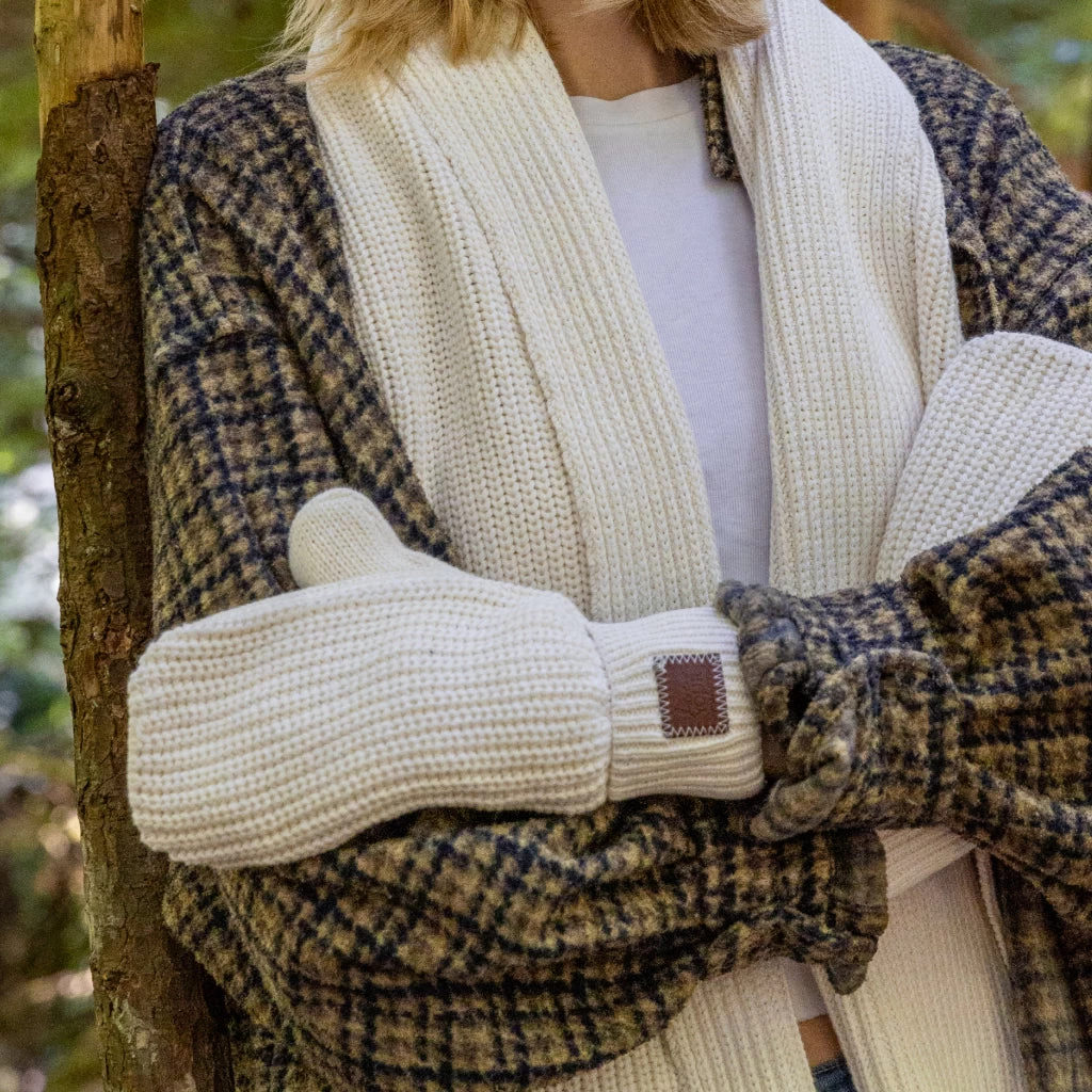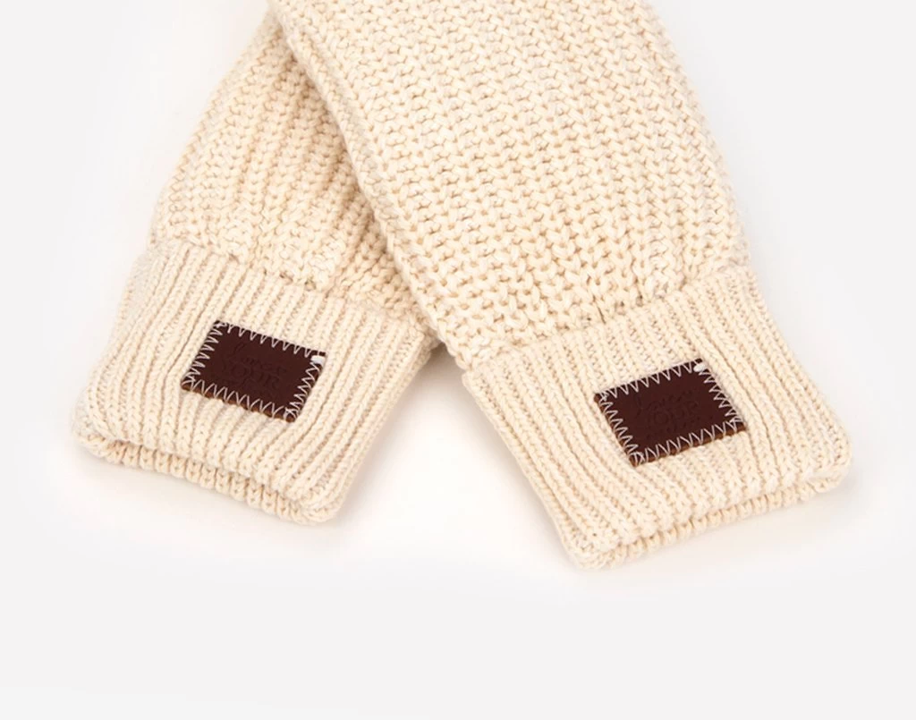 These mittens are knit in natural and white yarn colors and are very comfortable and warm. They feature a mini red maple Love Your Melon patch on the outer cuff.