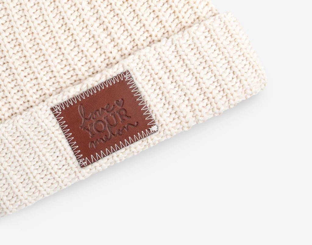 This white speckled pom beanie features a red maple leather patch debossed with the Love Your Melon logo on the front and a detachable natural faux fur pom. These beanies are very cozy and warm and fit more snug.